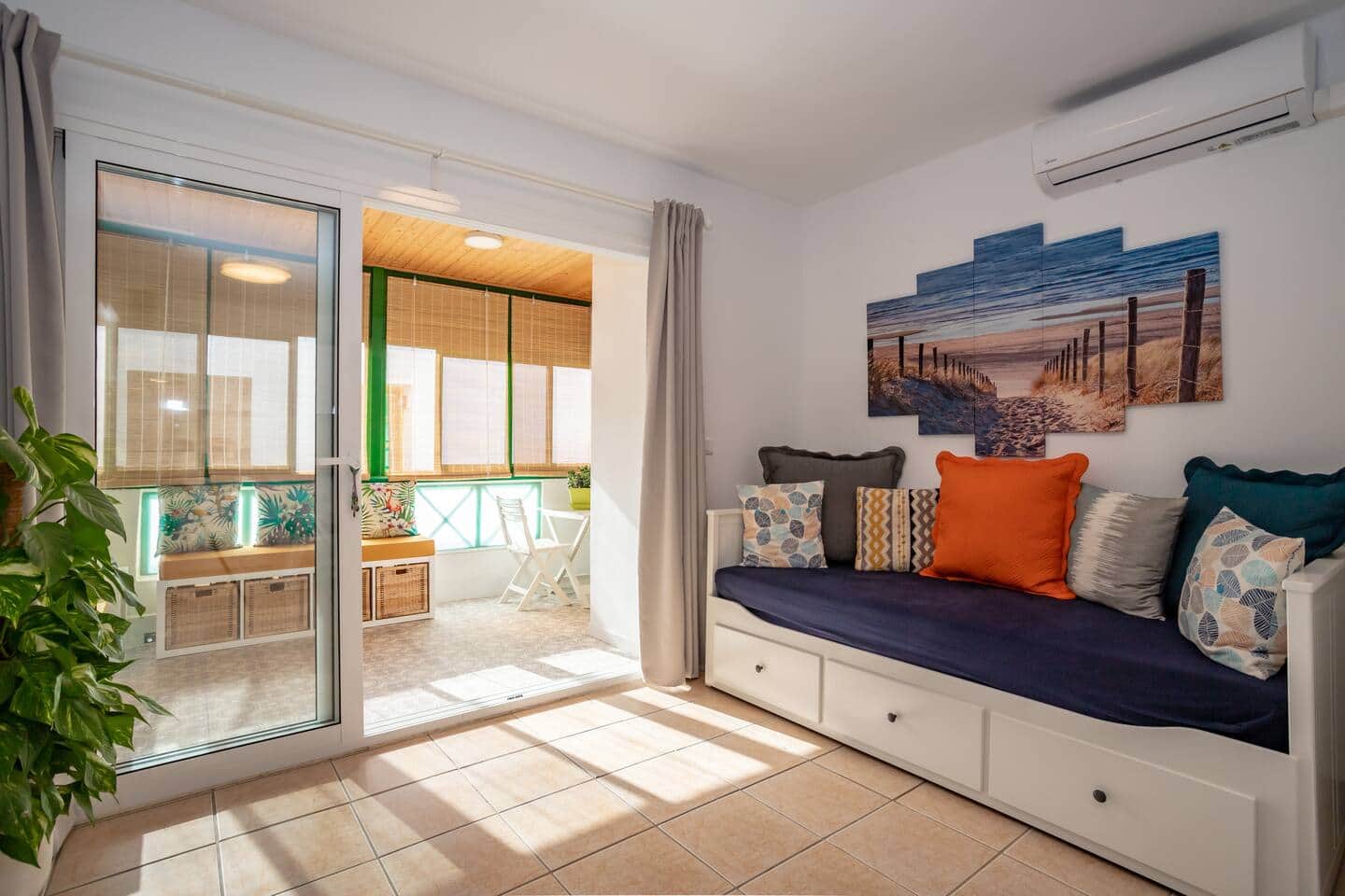 The living room has a small dining area, a sofa bed (single or double), TV, air conditioning, and internet access.